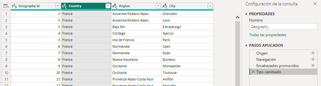 Y, si hacemos clic encima del aspa, veremos cómo el paso en cuestión desaparece, se selecciona el paso anterior y la interfaz ahora muestra el estado de nuestra tabla tras la ejecución del paso <em>Tipo cambiado</em>: