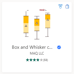 Estos paneles incluyen el nombre del objeto visual (<em>Box and Whisker c…</em> en la imagen anterior), el desarrollador (<em>MAQ LLC</em>), la valoración que ha recibido de los usuarios y el número de votos recibidos (58 votos, con una media de 4 estrellas), si ha pasado un proceso de certificación por parte de Microsoft (el icono azul que se muestra a la derecha del nombre del objeto visual), etc.