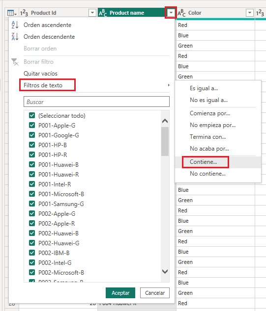 Como podemos apreciar, en este nombre se incluye el nombre del fabricante. Si quisiéramos filtrar esta tabla de forma que solo mantuviesen los productos de Apple, podríamos hacerlo con un clic en el botón en cuestión, otro clic en <em>Filtros de texto</em> y otro en la opción <em>Contiene...</em>: