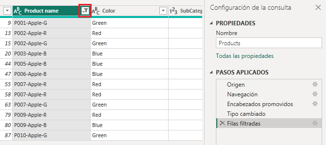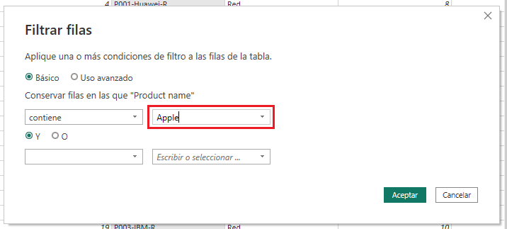 Escribimos “<em>Apple</em>” y, tras un clic en el botón <em>Aceptar</em>, veremos la tabla filtrada y el paso añadido al proceso ETL: