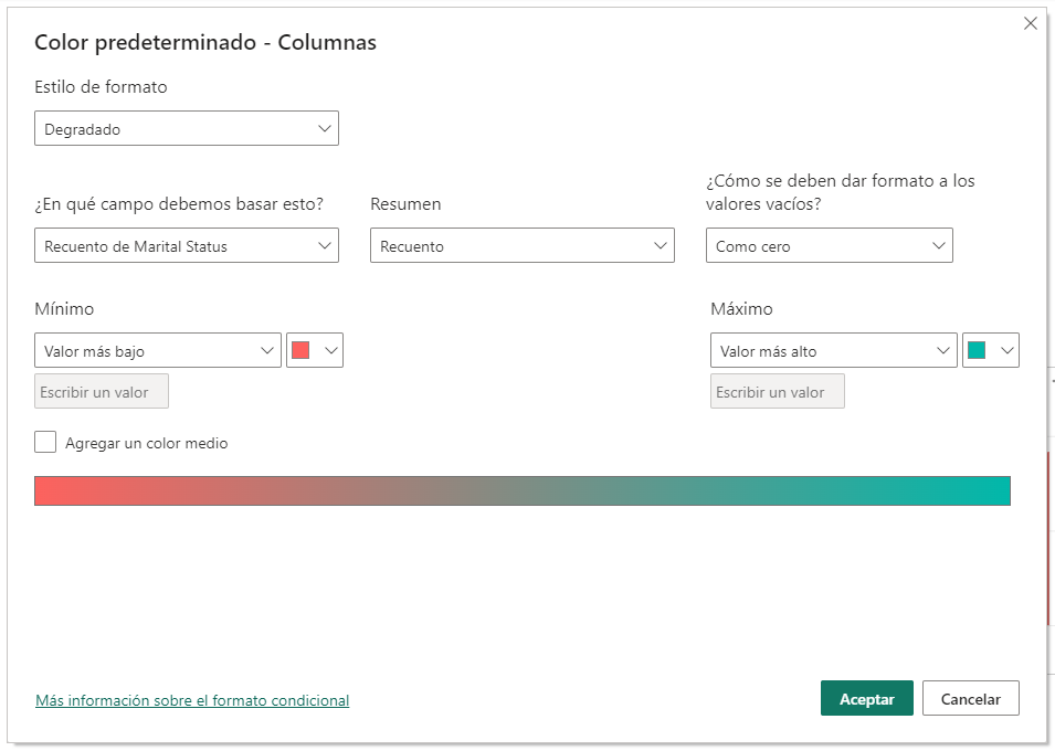 <li><strong>Valor de campo</strong>: Aplica a las marcas gráficas colores contenidos en una columna de una tabla o los colores devueltos por una medida DAX.</li>