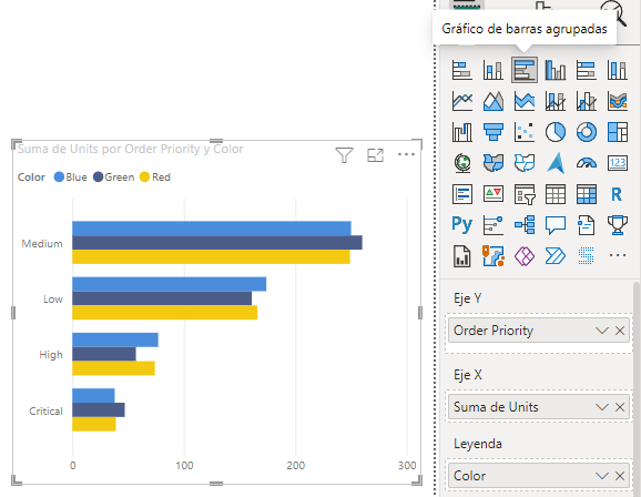 Una vez más, los campos de configuración son los mismos que en las gráficas anteriores. Y también aquí la única posible ventaja con respecto a su versión vertical es poder visualizar las etiquetas de las categorías más cómodamente, especialmente si son largas.
