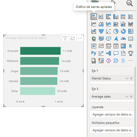 Podemos convertir nuestro gráfico de columnas apiladas en uno de barras apiladas, seleccionándolo y haciendo clic en el icono correspondiente del panel de visualizaciones: