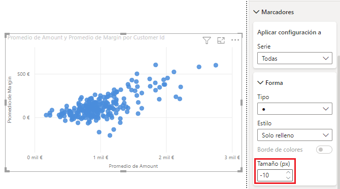 Podemos controlar el tamaño de los puntos en el panel de formato, bloque <em>Objeto visual</em>, sección <em>Marcadores</em>: