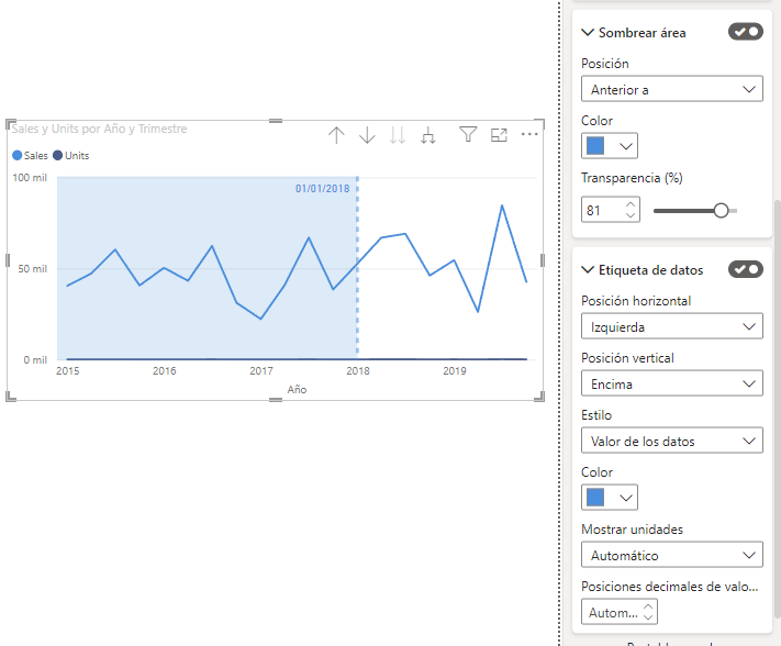 Y en la parte inferior del panel de configuración encontramos dos opciones adicionales: <em>Sombrear área</em>, que permite resaltar el área que queda a la izquierda o derecha de la línea, y <em>Etiqueta de datos</em>, que permite mostrar el valor en el eje X en el que se está mostrando la línea: