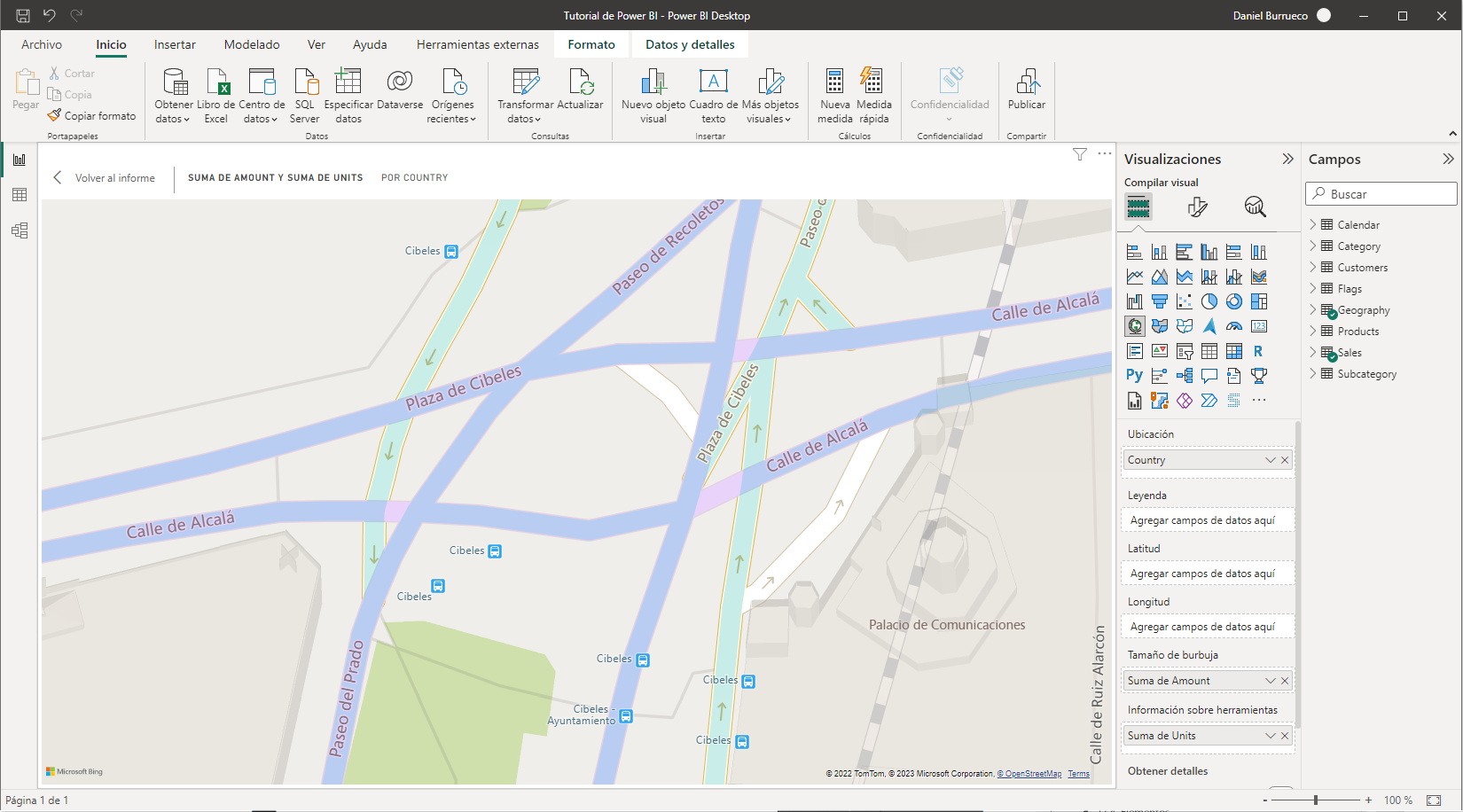 Tal y como ocurre aunque no entremos en modo de enfoque, si el objeto visual es un mapa podemos pinchar y arrastrar el ratón para moverlo, y usar la rueda del ratón para modificar el zoom. De hecho, si ampliamos mucho el zoom en ciertas ciudades (pues no está disponible siempre), llegará un momento en el que veamos unas líneas azules por encima de las calles. Por ejemplo, en Madrid:
