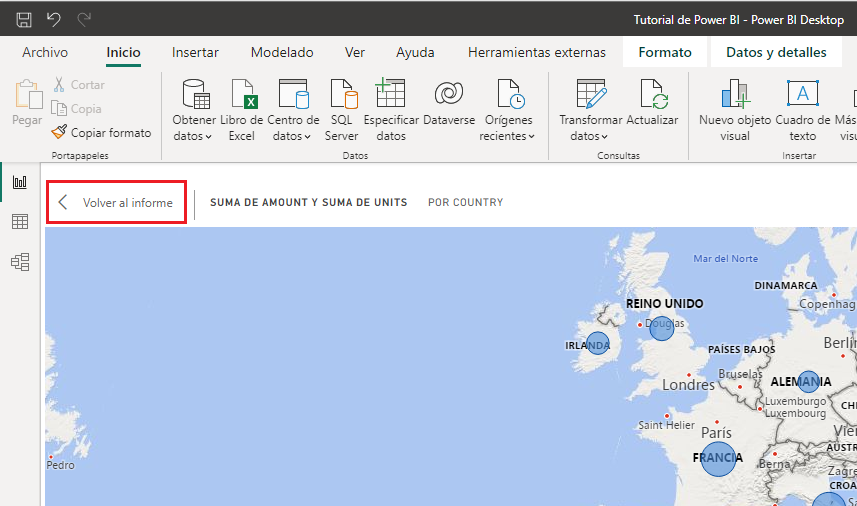 Y, una vez que hemos salido del modo Streetside, para salir del modo de enfoque tendremos que hacer un clic en la etiqueta Volver al informe que se muestra en la esquina superior izquierda: