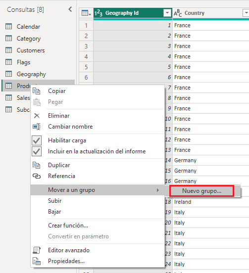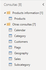 Ahora, si hacemos clic en el botón <em>Aceptar</em> veremos que se han creado dos grupos en el panel de consultas: el de <em>Products information</em> conteniendo nuestra consulta <em>Products</em>, y otro que ha recibido el nombre de <em>Otras consultas</em> conteniendo el resto de las consultas. A la derecha del nombre cada grupo se muestra entre paréntesis el número de consultas que contiene: