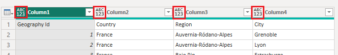 Eso sí, comprobamos que en la primera fila de la tabla figuran los que deberían ser nombres de columnas, y vemos que éstas no han recibido tipo (texto, número entero, etc.), cosa que podemos comprobar fijándonos en los iconos con el texto “<em>ABC123</em>” que se muestran a la izquierda de los nombres: