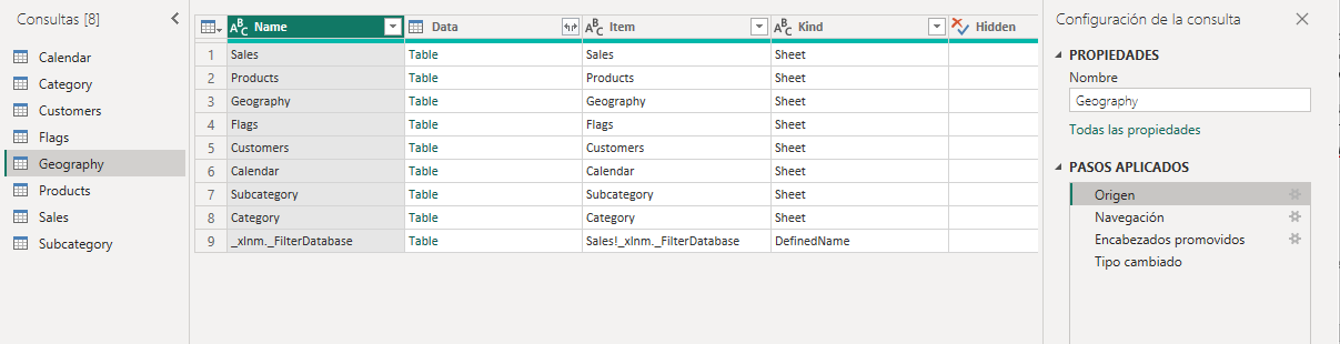 Es decir, en el paso <em>Origen</em> el editor de consultas simplemente se conecta a la fuente de los datos y extrae información sobre qué tablas se encuentran en ella, sin seleccionar ninguna.