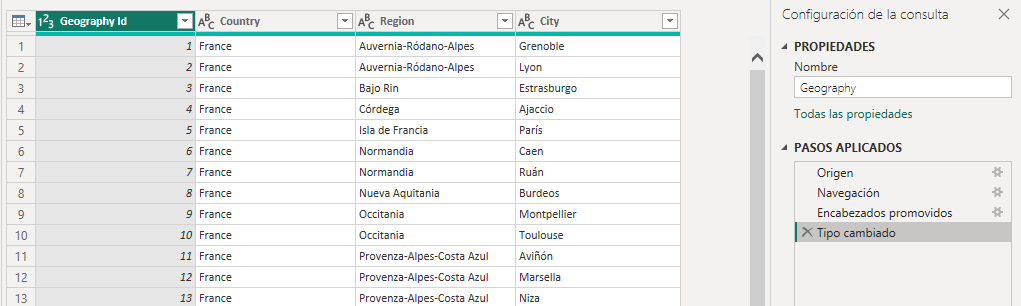 Concretamente, el campo <em>Geography Id</em> ha recibido el tipo de número entero (lo que sabemos por el icono con el texto "<em>123</em>") y los otros tres campos han recibido el tipo texto (cosa que sabemos por el icono con el texto "<em>ABC</em>"):