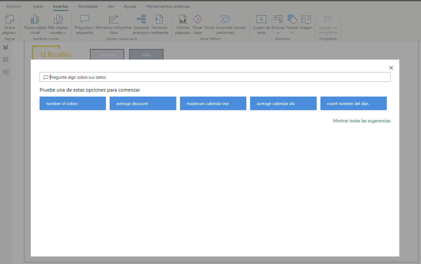 Esta acción fuerza la apertura de una ventana en la que -supuestamente- poder hacer preguntas en lenguaje natural sobre nuestros datos a Power BI. Para probarla, creemos en la tabla Sales un botón:
