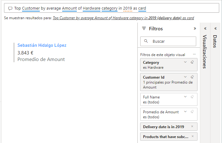 En todo caso, la práctica nos dice que nuestro lenguaje no puede ser demasiado “natural” si queremos que Power BI nos muestre el resultado correcto, por lo que resulta necesario un cierto aprendizaje del tipo de preguntas que son mejor interpretadas y de cómo plantear los diferentes bloques que las componen (especificando las métricas involucradas, los filtros a aplicar, el tipo de visualización a usar, etc.).