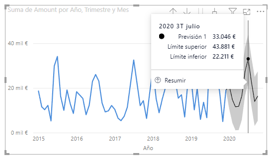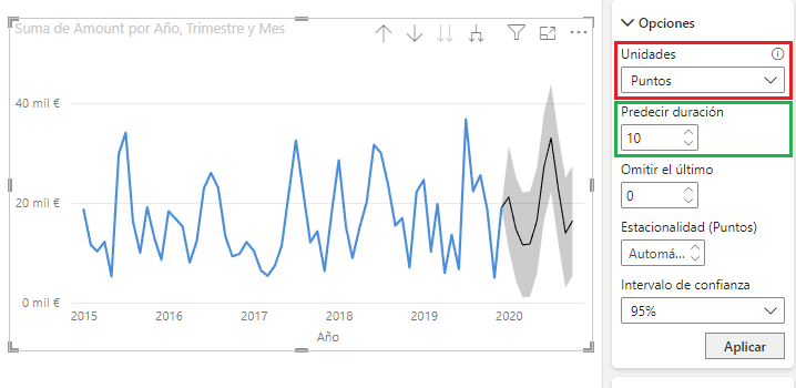 Lo primero que podemos hacer es especificar la unidad temporal para la que realizar la predicción (desplegable <em>Unidades</em> resaltado en rojo en la imagen anterior). El valor “<em>puntos</em>” supone que las predicciones se van a adaptar al nivel temporal mostrado en la gráfica (años, trimestres, meses o días). Es decir, si en el formulario <em>Predecir duración</em> (en verde en la gráfica anterior) se muestra el valor 10 y la gráfica está mostrando datos a nivel de meses, la predicción sería para 10 meses. Si en el objeto visual subiésemos al nivel de trimestres, la predicción sería para 10 trimestres, etc. Si queremos especificar que el período a usar sea uno concreto con independencia de lo que esté mostrando la gráfica, deberemos escoger dicho período en el desplegable <em>Unidades</em> mencionado.
