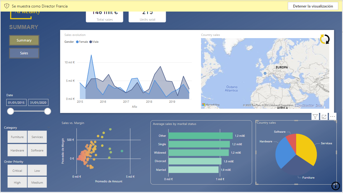 comprobamos en el mapa que, efectivamente, solo se está visualizando Francia (y podríamos comprobar que el resto de los objetos visuales están mostrando información solo relativa a ventas realizadas en dicho país). Obsérvese que en este rol no se está imponiendo ningún filtro a la tabla de categorías, por lo que nuestra gráfica circular muestra todas las categorías disponibles.