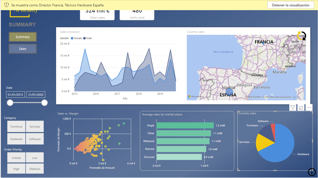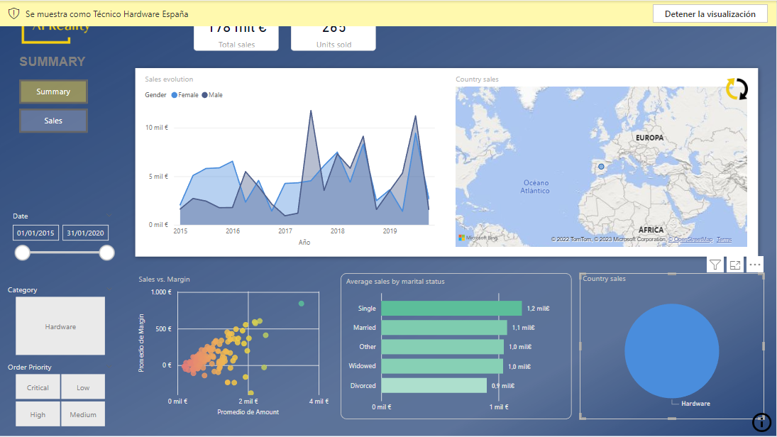 vemos que, en este caso, solo se muestra España en el mapa y la categoría <em>Hardware</em> en el gráfico circular. Y podríamos comprobar que el resto de los objetos visuales muestran información de ventas realizadas en España de productos de la categoría <em>Hardware</em>.