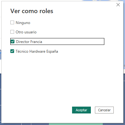 En este listado podemos escoger el rol que queremos probar. Por ejemplo, si hacemos clic en <em>Director Francia</em> y otro clic en el botón <em>Aceptar</em>: