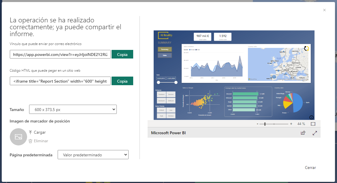 El segundo es usando un “<em>iframe</em>”, código que nos permite insertar el informe en una página que ya exista. El botón <em>Copia</em> que se muestra a la derecha de esta segunda opción también copia el código en cuestión al portapapeles.
