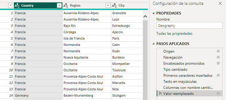 En nuestro caso solo hay 8 países distintos y el texto “<em>France</em>” solo aparece en el nombre de uno, de forma que no es relevante que marquemos o no esta última opción. Si hacemos clic en el botón <em>Aceptar</em>, veremos que la columna <em>Country</em> ahora muestra el país “<em>Francia</em>” y que el panel de <em>Pasos aplicados</em> incluye el nuevo paso: