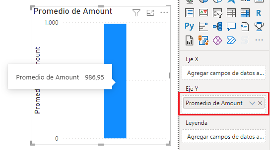 Escojamos, por ejemplo, la función <em>Promedio</em>. Ahora la gráfica muestra una columna cuya altura viene determinada por el valor medio de los valores incluidos en la columna <em>Amount</em>. Tal y como podemos ver en la ventana de información de la gráfica, esta cifra es de 986 €: