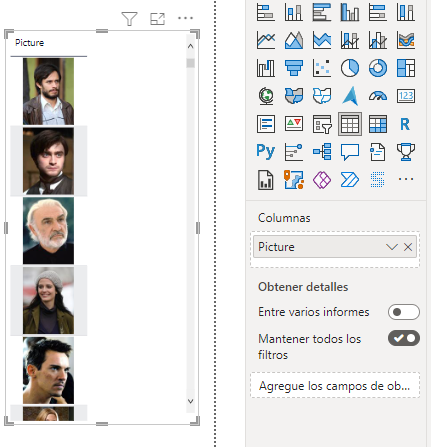 Vemos que las imágenes se muestran pequeñas. Si abrimos el panel de formato de la tabla y vamos a la sección <em>Objeto visual > Altura de la imagen</em>, vemos que, por defecto, la altura de la imagen es de 75 píxels, pero que podemos aumentarla hasta -solo- 150 píxels:
