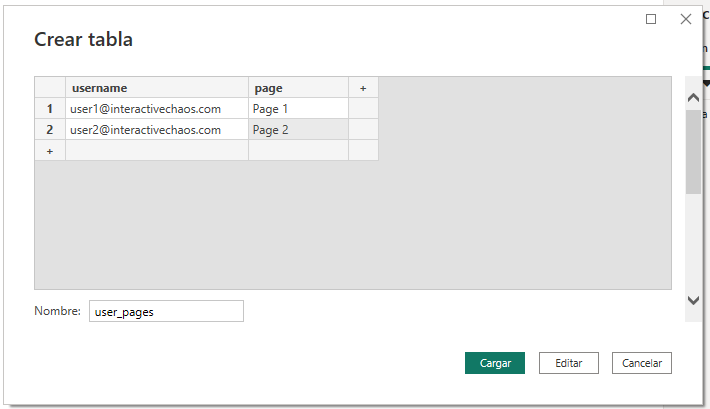 A continuación, necesitamos una tabla que mapee los usuarios con las páginas a las que se les quiere dar acceso. Supongamos que queremos que el usuario "user1@interactivechaos.com" acceda a la página “Page 1” y el usuario "user2@interactivechaos.com" acceda a la página “Page 2”.