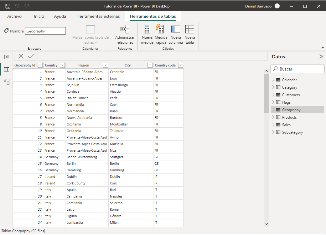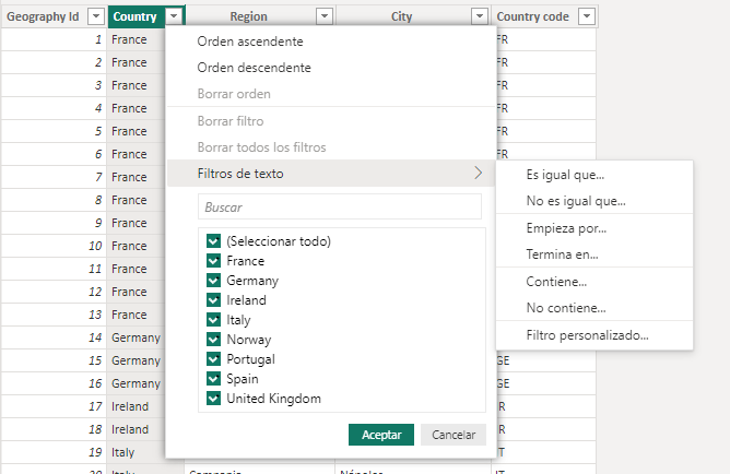 Así, si en la pantalla anterior dejamos seleccionado solamente el valor “<em>Germany</em>” y hacemos clic en el botón <em>Aceptar</em>, la vista mostrará solo las ciudades alemanas: